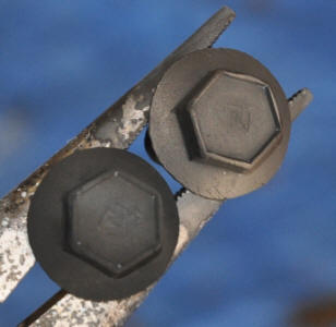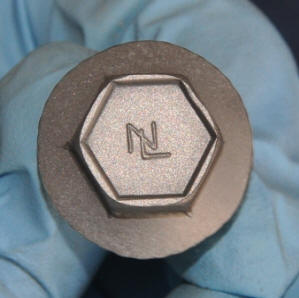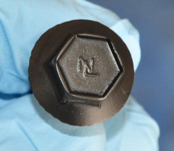 | Let's follow the process with several bolts, removed from the shock tower on the front fender. I have sandblasted these with some rather coarse sand. I had to use a dental pick to clean the inner edge of the recesses in the top of the bolt. Notice the neat NL logo. This was obscured with corrosion until I sandblasted the bolt. On the right is the phosphoric etchant. This most likely differs from the Eastwood kit because it has surfactants in it, thus the bubbles. This is actually a benefit, since it will clean any remaining contaminants that may be on the part. I handle everything with nitrile gloves from Harbor Freight. |