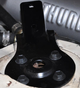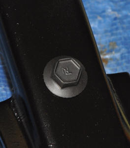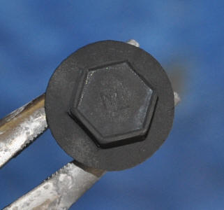The bolts in the left picture below show a freshly oiled bolt on the left, and one that has been allowed to soak over night. The third bolt is a black phosphate commercially available bolt without the correct logo.. The middle picture shows the bolt in the shock tower. You can see that it still is retaining a dull steel color compared to the black paint. At the right, the bolt is installed on the shock tower in the engine compartment. The bolts did not suffer any finish damage from the socket. |