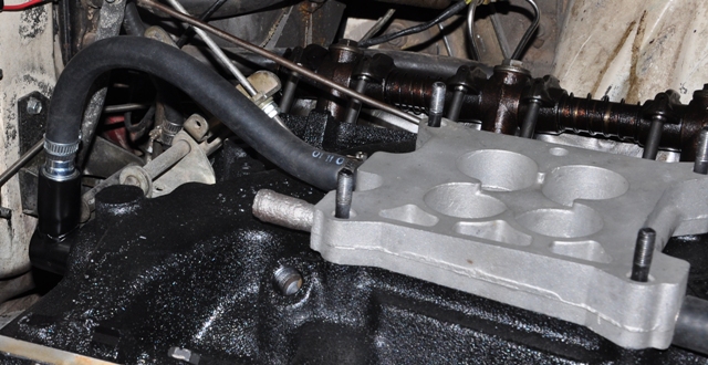 Here is the complete system with the 1/2" fuel-grade line running from the PCV to the baseplate. Although this is not the correct PCV system for the car, it basically cost me $11.00. $3.00 for the PCV valve, $7.00 for the baseplate, and $1.00 for the 1/2" hose. |