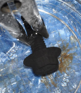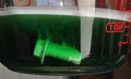 | Add enough etchant to your Pyrex measuring cup to cover the items to etch. The directions on the bottle for phosphatizing say to dilute 1 part acid to 3 parts water. I used the etchant full strength for my first run. I discovered there was no need to dilute it. Place the bolt in the etchant with an old pair of pliers as the chrome will get etch off of them. The bolt will immediately begin to bubble, releasing a small amount of hydrogen gas. |